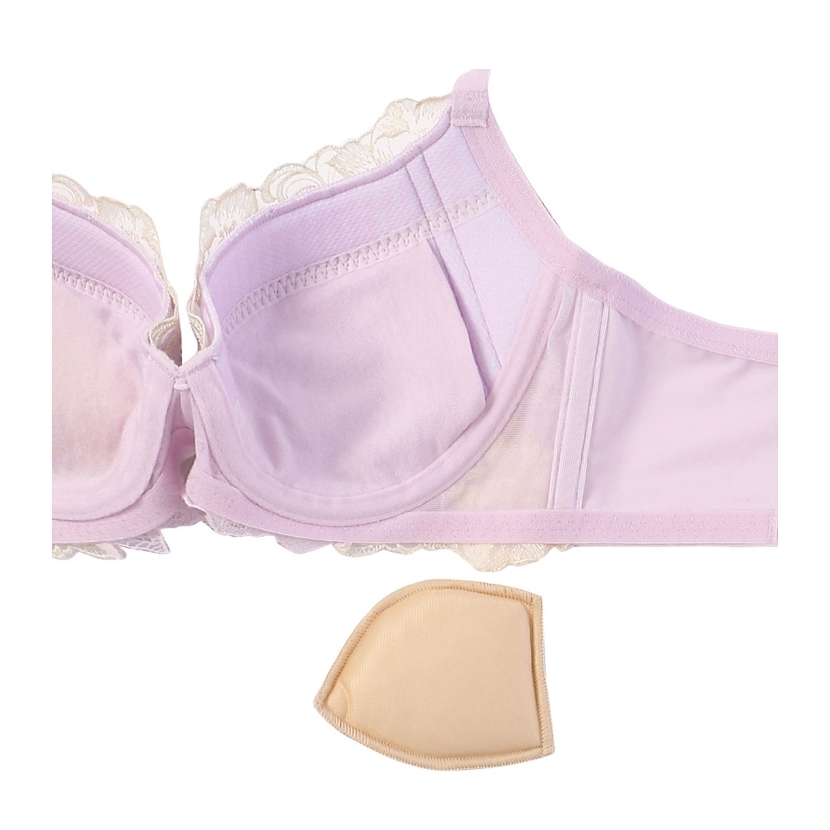 機能面では、カップ脇の非伸縮素材がバストの広がりを抑え、中央へしっかり寄せてくっきりとした谷間をメイク。保形性と耐久性に優れた「ファイバーフィル」を使用しているため、ソフトな着け心地ながらきれいなシルエットを長くキープします。