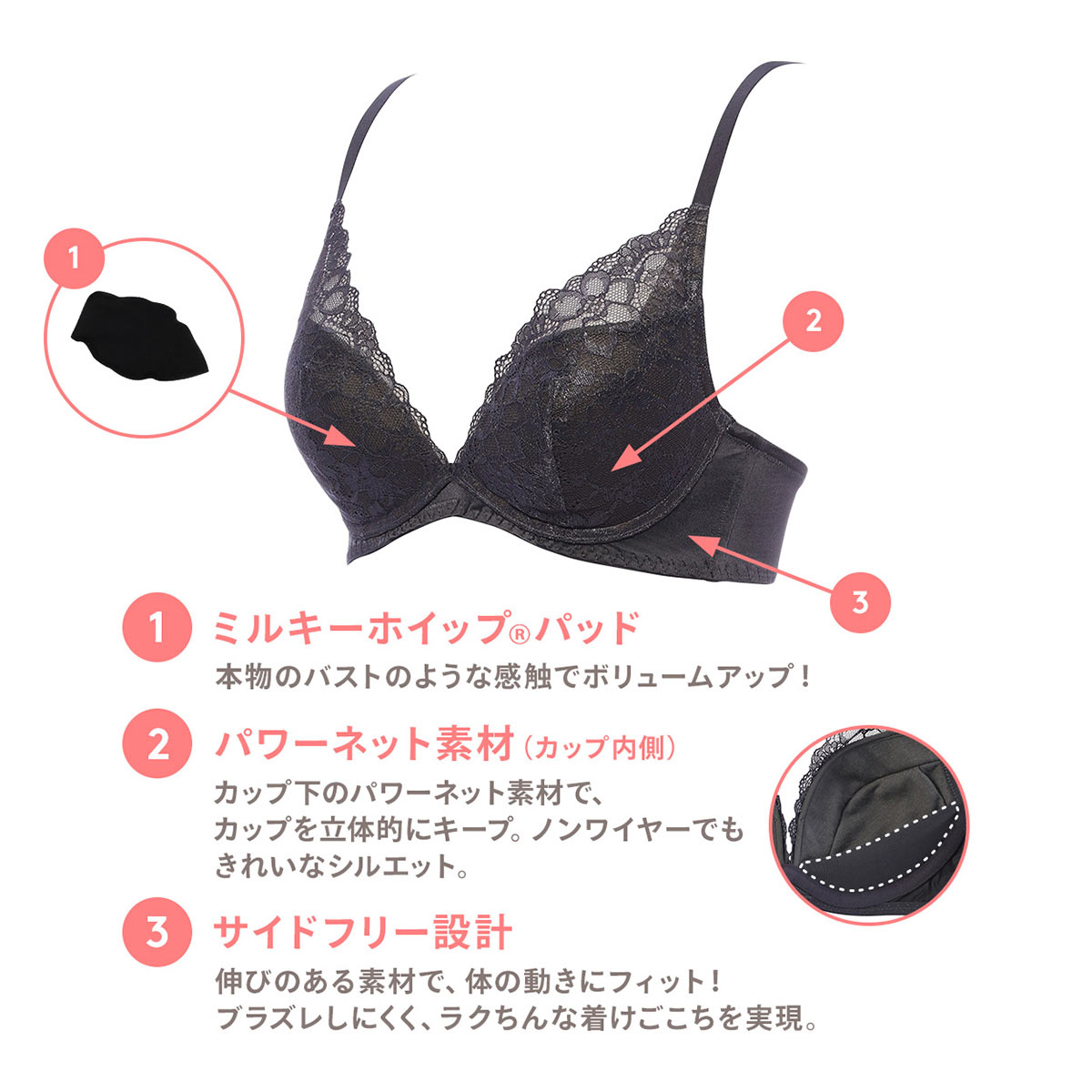 ノンワイヤーのブラジャーは、カップ下のパワーネットにより、締め付け感なくきれいな立体シルエットをキープ。本物のバストのような「ミルキーホイップパッド」が自然なボリュームを作ります。伸縮性に優れた素材が体の動きにフィットし、ズレにくくラクな着け心地です。ストラップはバッククロスにもアレンジでき、肩からのズレ落ちが気になる方にもおすすめ。