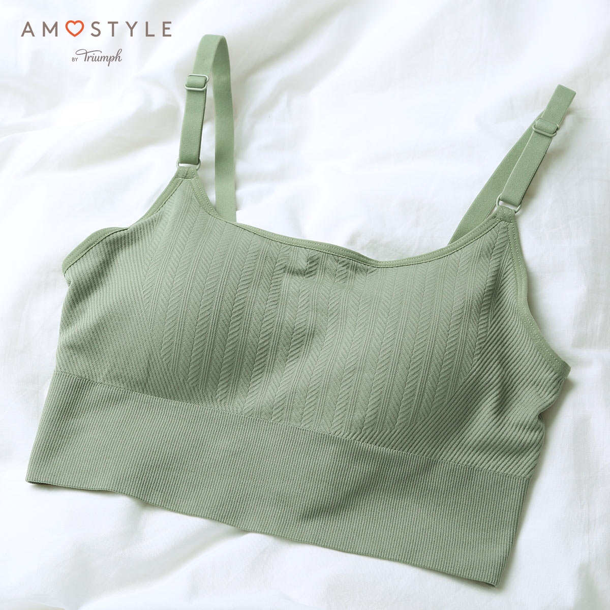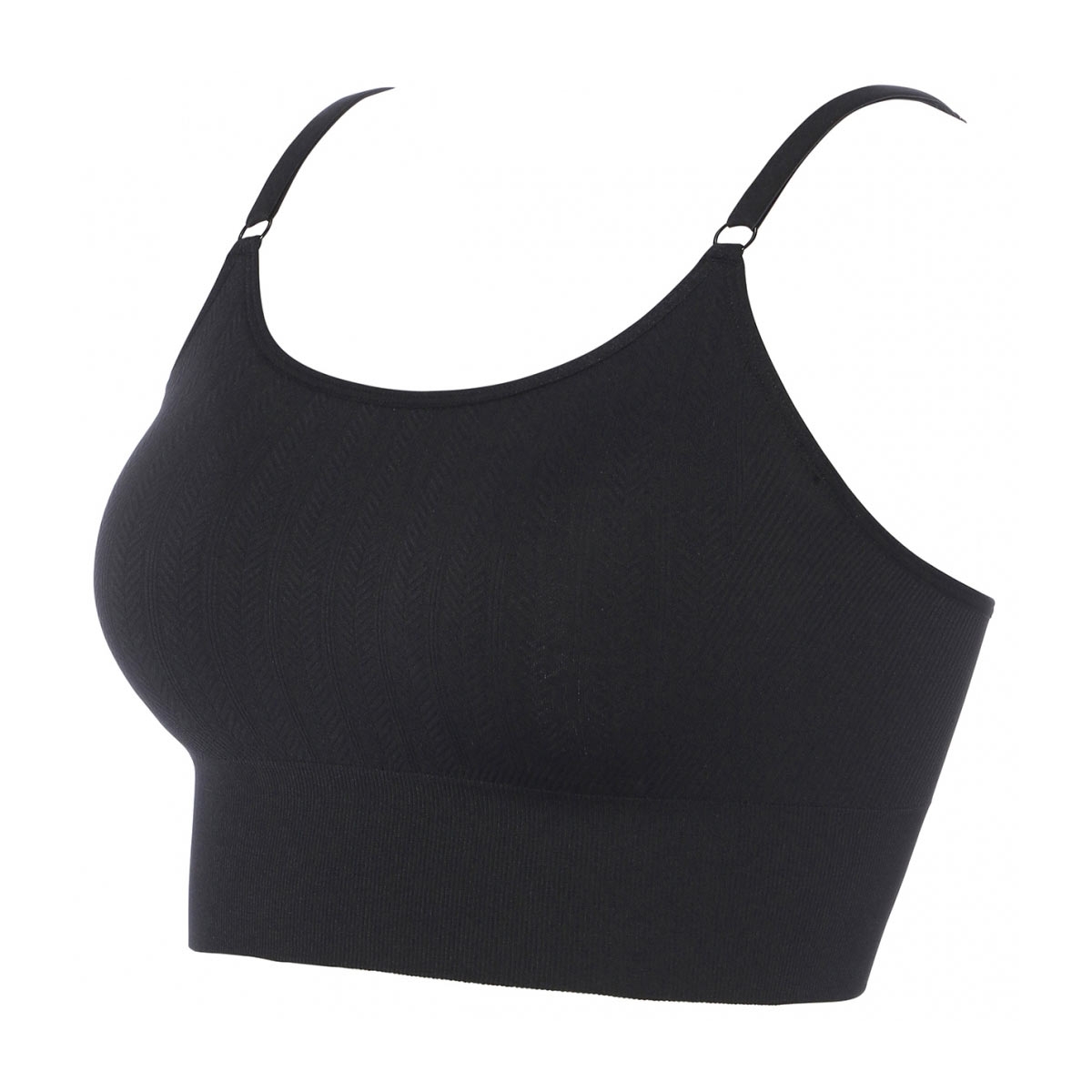 スタイリッシュなヘリンボーン柄のジャカード素材は、トレンドのシアートップスと合わせた「見せるインナー」としてもおすすめ。幅広のアンダーリブが、カジュアルで都会的な印象を与えます。