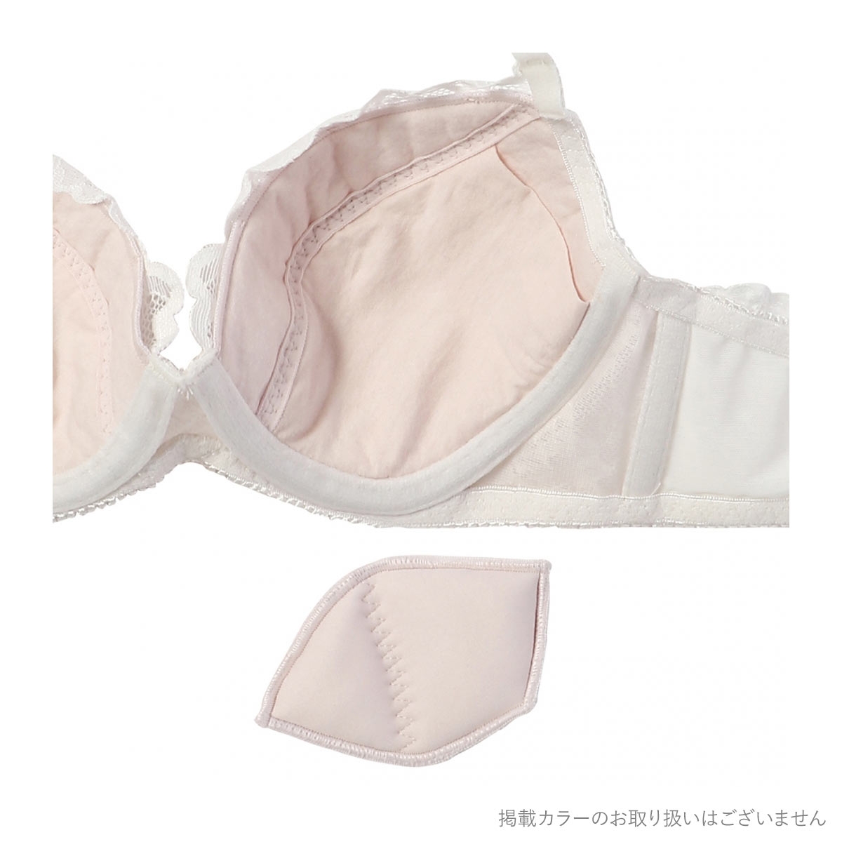 ブラジャーは、定番で使いやすい3/4カップタイプ。中央に縫い目を入れた「エンジェルシェイプパッド」が、バストの丸みに無理なくフィットし、盛りすぎない自然で美しいバストラインを整えます。背部はレースとパワーネットを重ねることで、デザインの美しさだけでなく、しっかりとした安定感のある着け心地を実現しました。