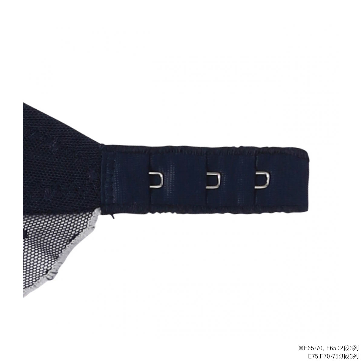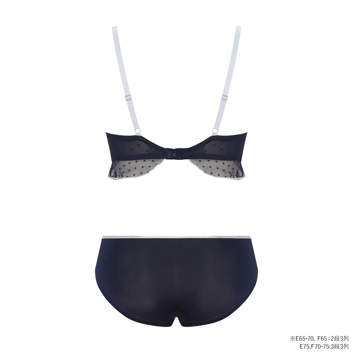 ブラジャーは前中心が低いL字ワイヤーを採用し、脇からバストを寄せて盛りすぎないナチュラルな谷間をメイク。センターのラインが低いため、ワイヤーのあたりが痛くなりにくく、軽やかな着け心地です。アクセントカラーを効かせたドットチュールと、アンダー部分のフリルが、遊び心のある可憐なシルエットを演出します。