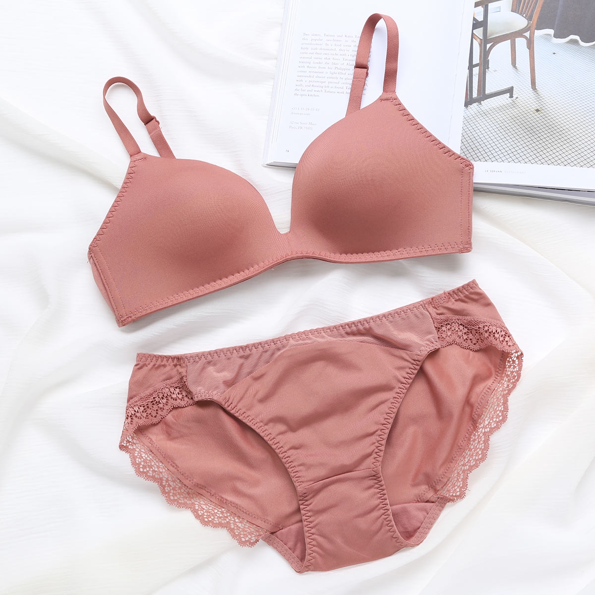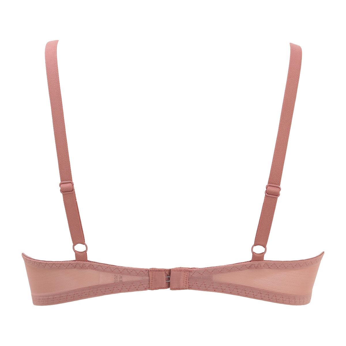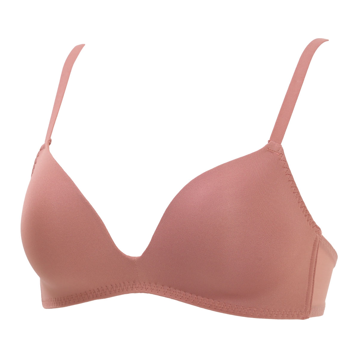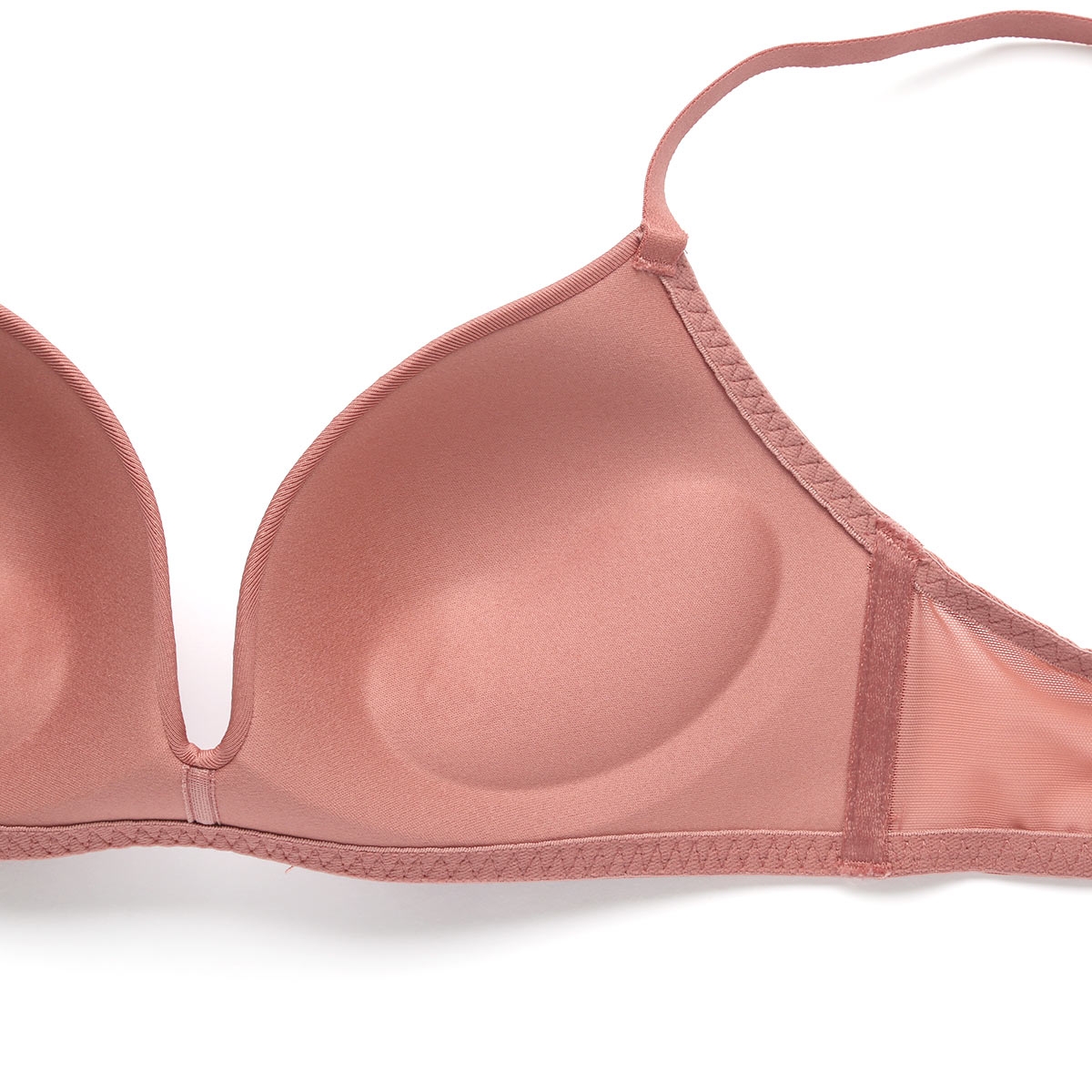 最大の特徴は、凹凸のないつるんとした質感のモールドカップ。縫い目やレースを一切使用していないため、タイトなTシャツや薄手のニットを着ても下着のラインが外側に響きません。カップ下部に適度な厚みを持たせることで、ノンワイヤーながらも盛りすぎない、ナチュラルで美しいバストラインを整えます。