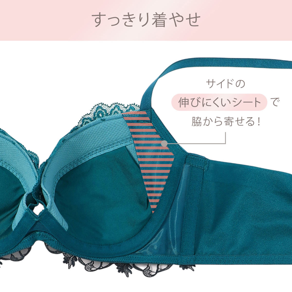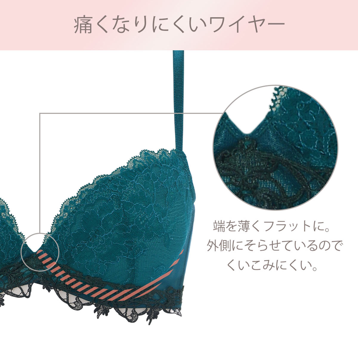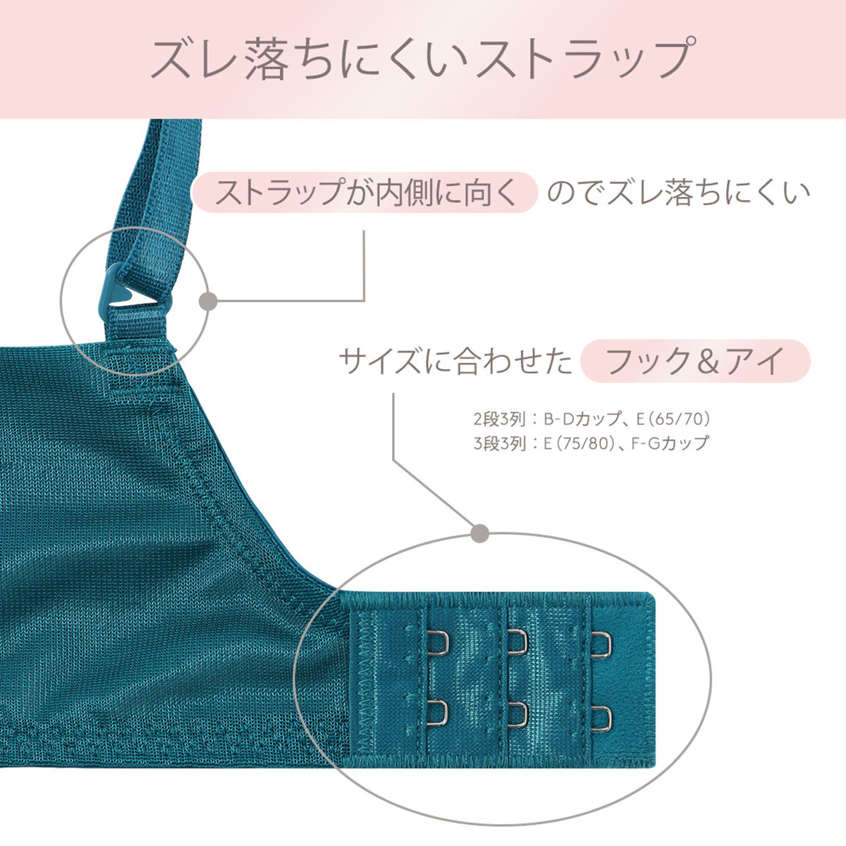 デザインは、妖精の衣装のような軽やかな編みレースとケミカルレースを使用したロマンチックな仕上がり。ストラップずれを防ぐ「デルタマジック」機能付きです。
