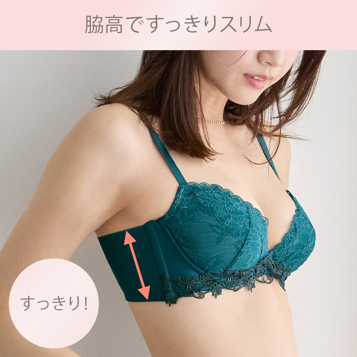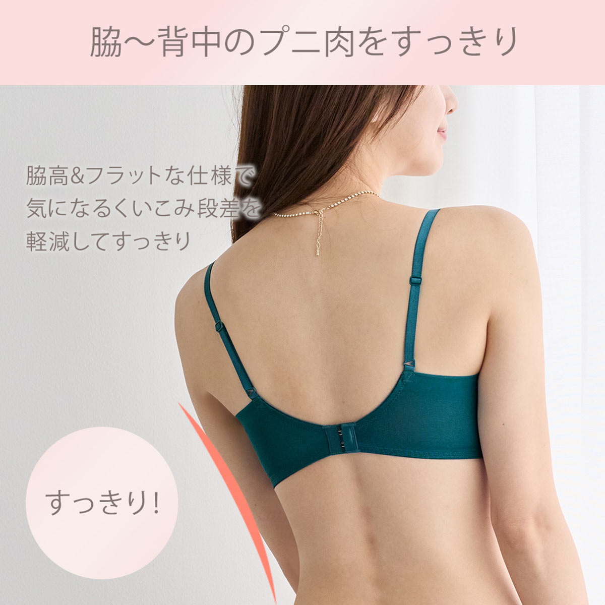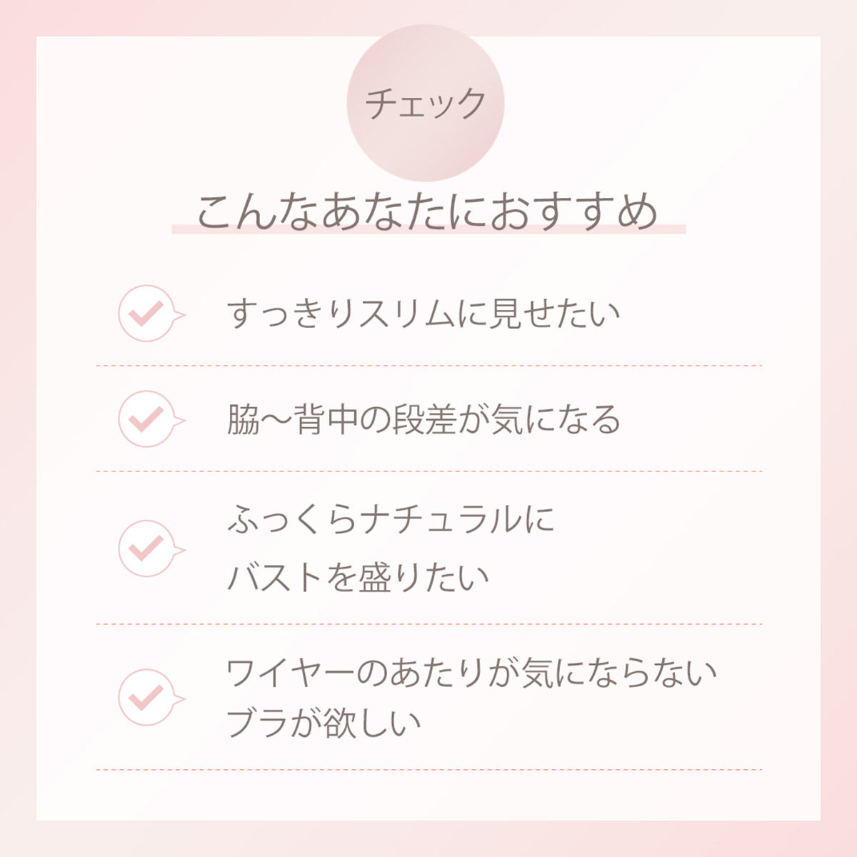 脇高・フラットな設計で、脇や背中の段差をすっきりスリムに整え、アウターをきれいに着こなせます。サイドボーンがずれにくくきれいな谷間をキープ。