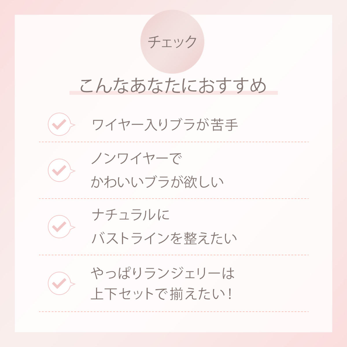 ラクな着けごこちを叶えるノンワイヤーブラとショーツがセットになったブラセットです。ワイヤーが苦手な方、お家時間も快適に過ごしたい方に最適です。