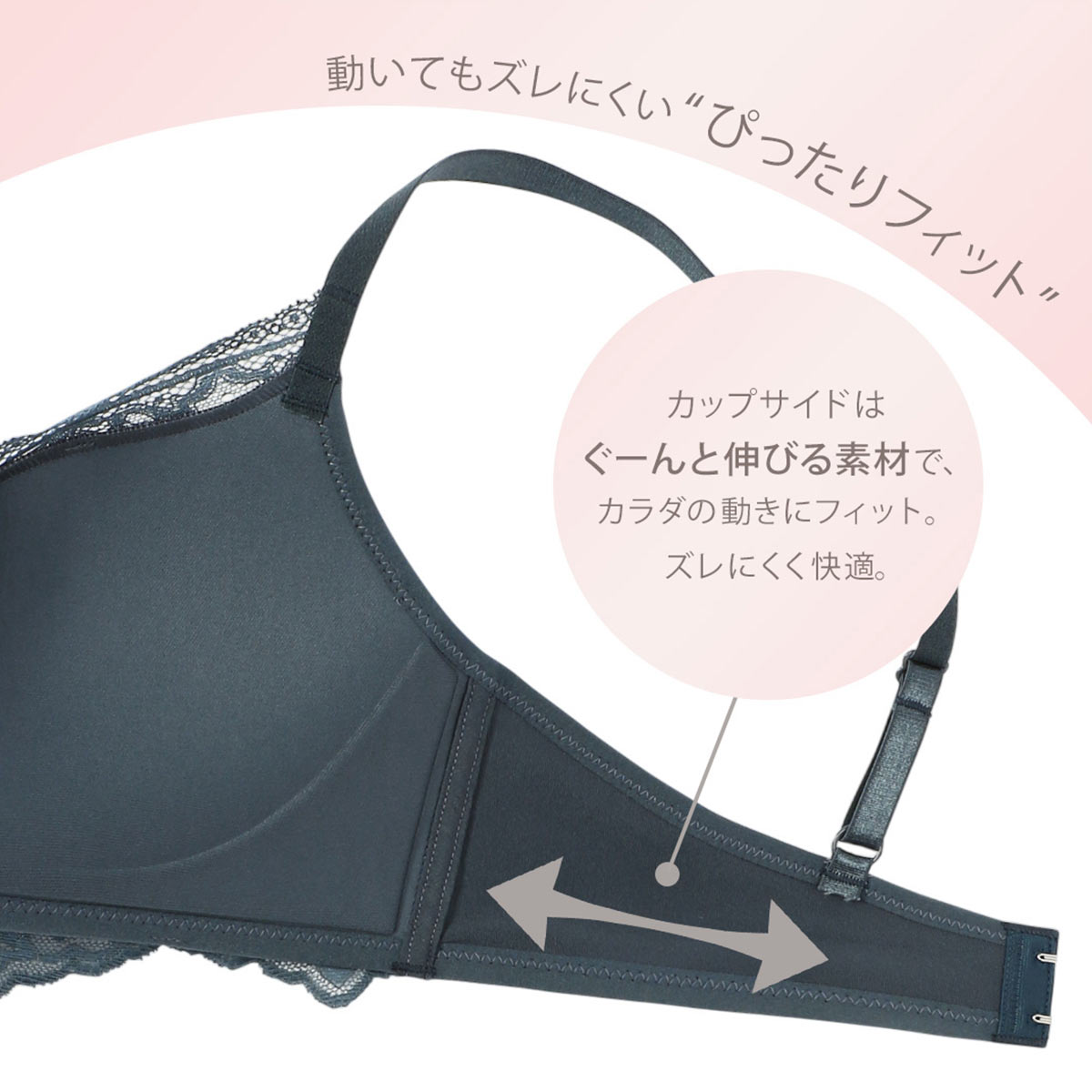 クッション性のあるカップは、盛りすぎないナチュラルな丸みとボリュームアップを実現。クラシカルなレースをミックスした大人かわいいデザインで、普段使いにぴったり。
