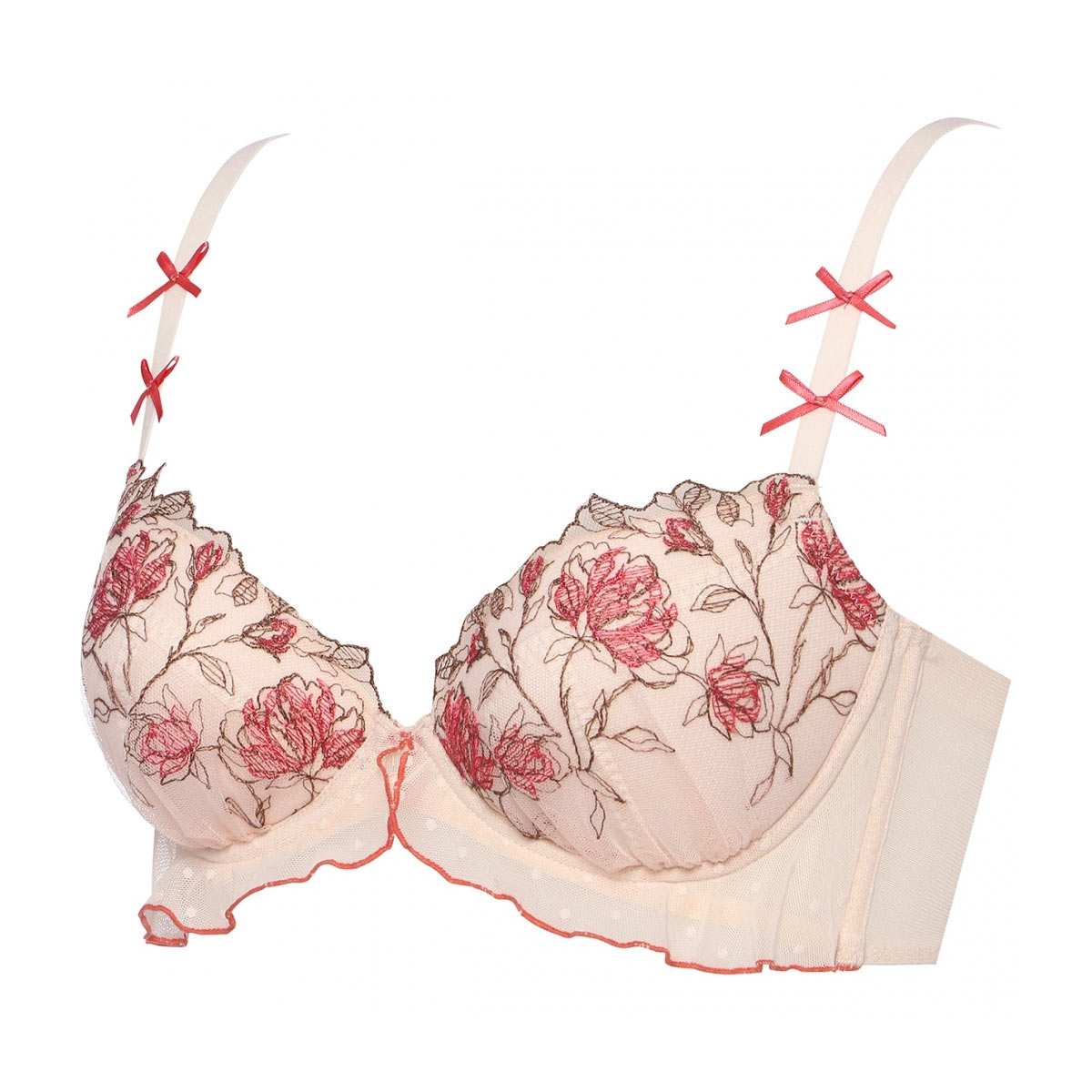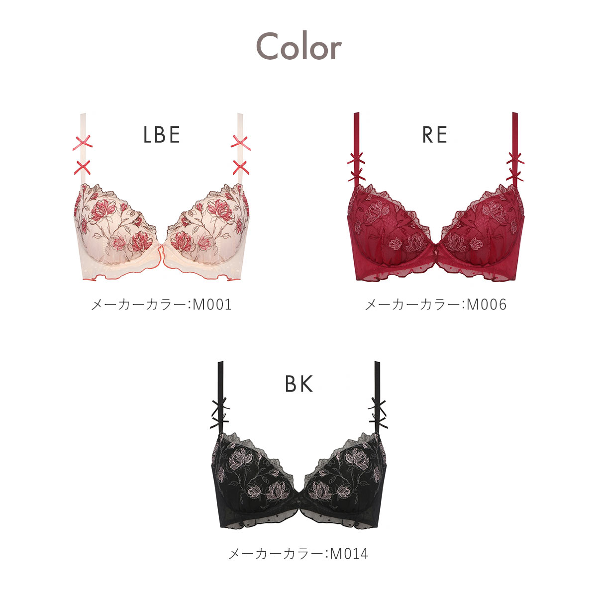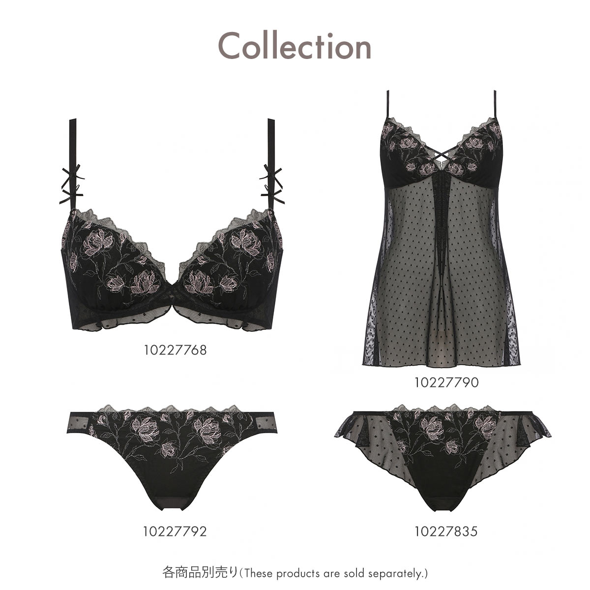 「脇高スリム」と「ふっくら谷間」を同時に叶える、機能性ブラジャー。自由に咲き乱れるバラのモチーフと、アンダー部分のドットチュールがフェミニンな気分を盛り上げる愛らしいデザインです。