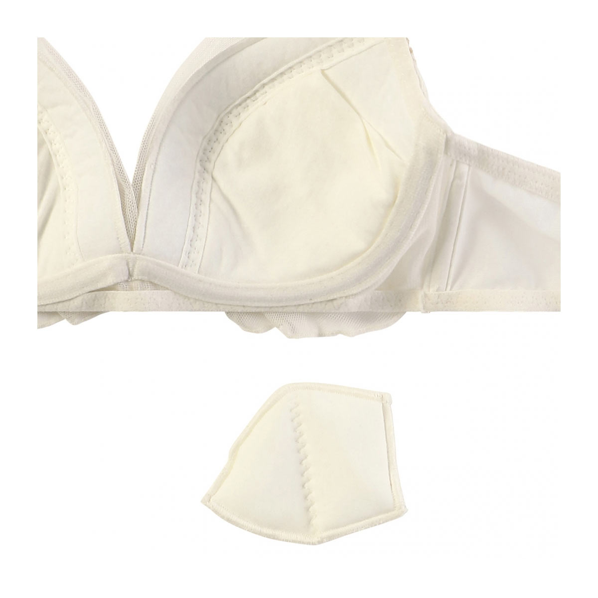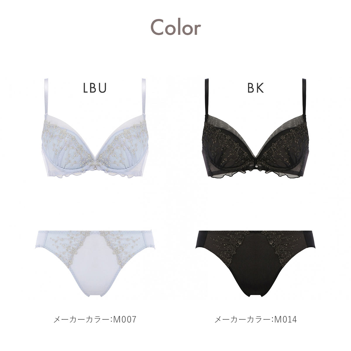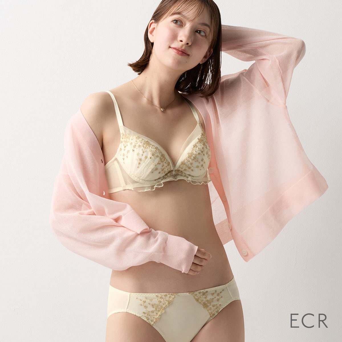 ブラジャーは前中心が低いL字型のパターンを採用。脇からバストを寄せて、盛りすぎないナチュラルな谷間をメイクします。センターのラインが低いため、ワイヤーのあたりが痛くなりにくく、軽やかな着け心地です。カップ上辺のチュールネットや、センターで輝くラインストーンが、女性らしく可憐な印象を際立たせます。