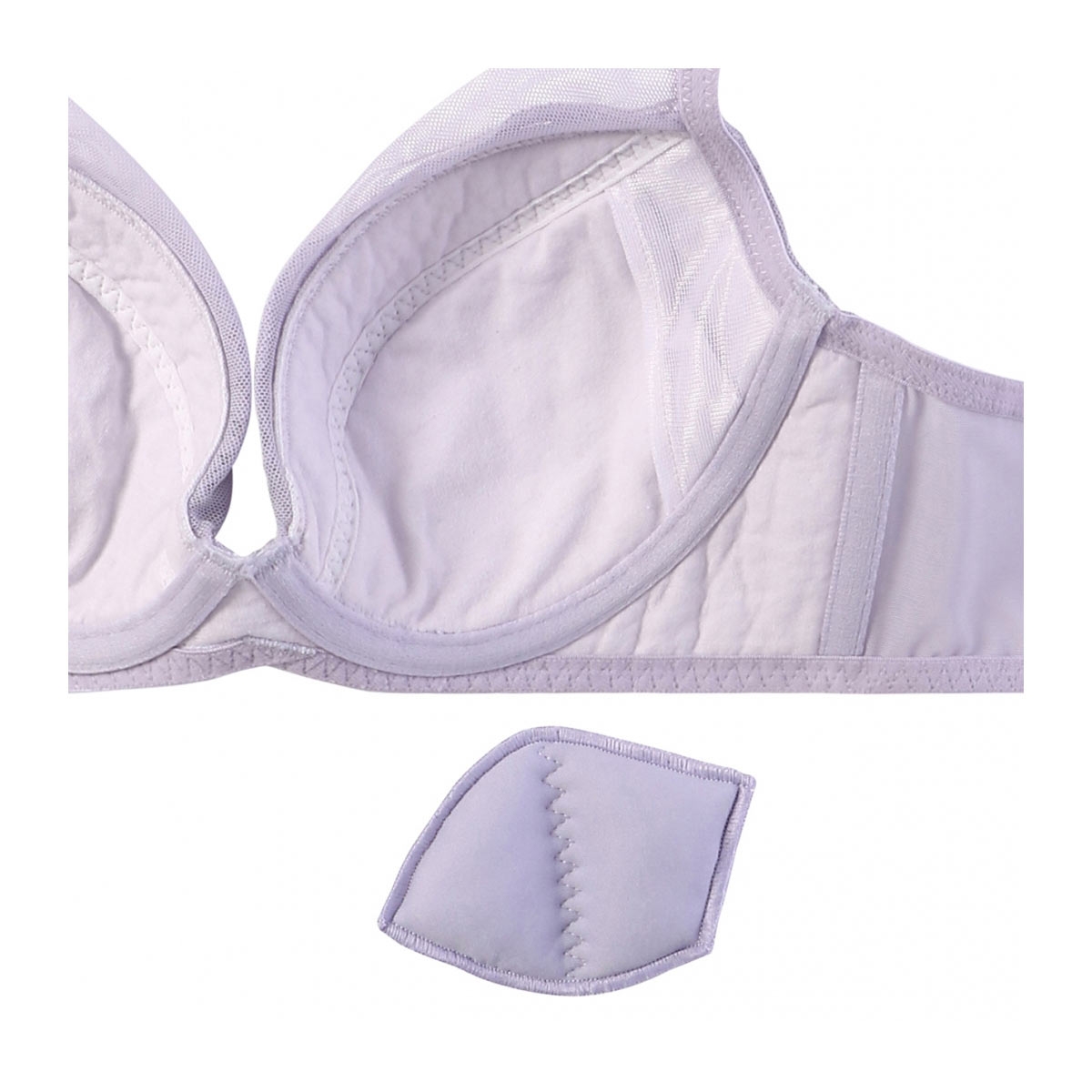 さらに、土台部分まで柔らかいカップ素材で包み込むことで、ワイヤーのあたりや段差を軽減。圧迫感の少ないやさしい着け心地ながら、高いホールド力を実現しました。取り外し可能なパッドは中央に縫い目を入れた特殊形状で、バストの丸みにしなやかにフィットし、自然なボリュームアップを叶えます。