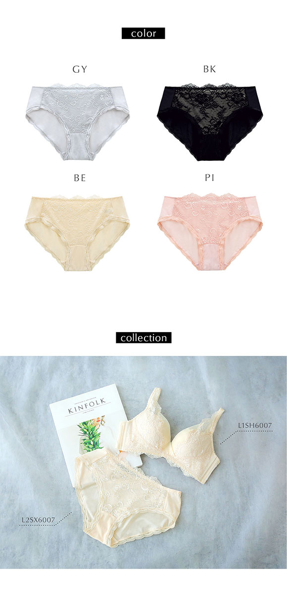| 仕 様 | ・フロントは横に、バックは縦横に伸縮性あり ・クロッチ:付き ・透感:フロントにあり ・クロッチ、フロント裏打ち部分は綿混素材 ・股上:(M)約16cm (L)約17.5cm (LL)約18cm(※レース含む置き寸法) |