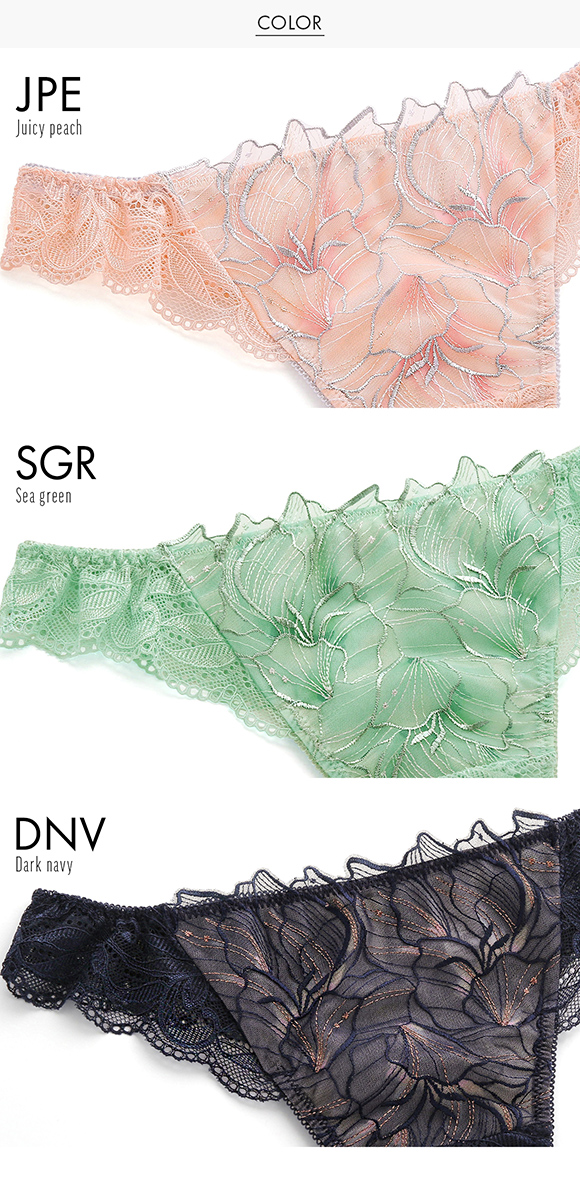 シアーなレースが肌に美しく映えるタンガは、サイドからバックが柔らかなストレッチレース。後中心は細くないので食い込みにくく、着用ストレスがありません。