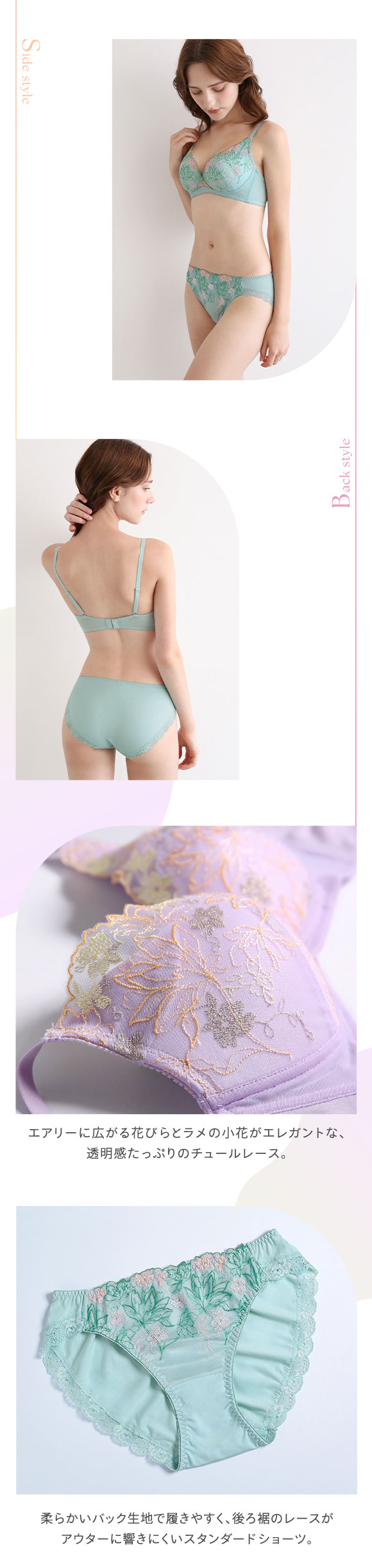セットショーツはデイリーに使いやすいスタンダードタイプ。前レースの裏打ちは薄手のトリコットで、柔らかな透け心地です。バックは縦横に伸縮性のある素材ではき心地良く、ヒップをすっぽり包み込みます。後ろ裾もストレッチレースで、アウターに響きにくい1枚です。