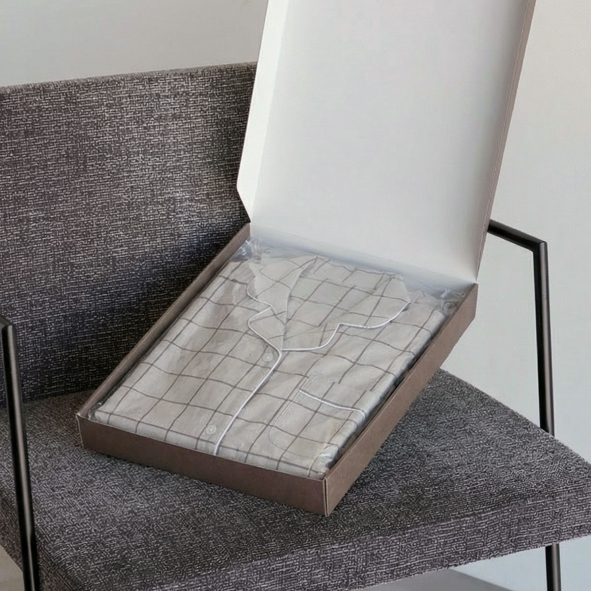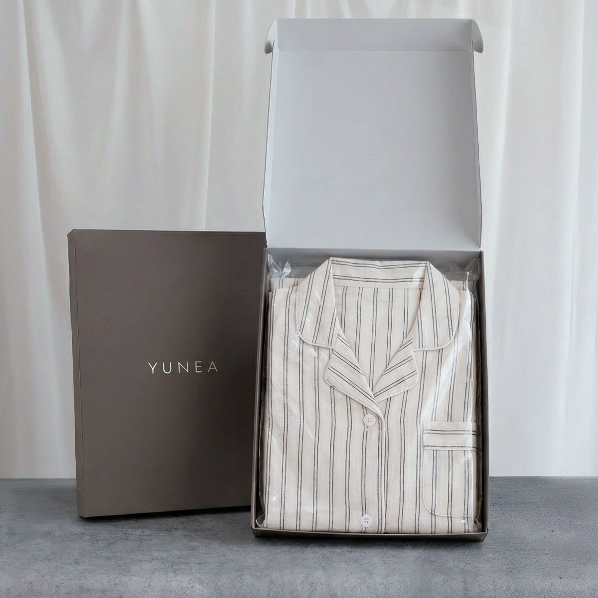 マットな質感に繊細な箔押しロゴが入った、YUNEAのパジャマ専用ギフトボックス。落ち着いた大人なカラーリングが特別感を高める、オリジナルの専用ボックスです。